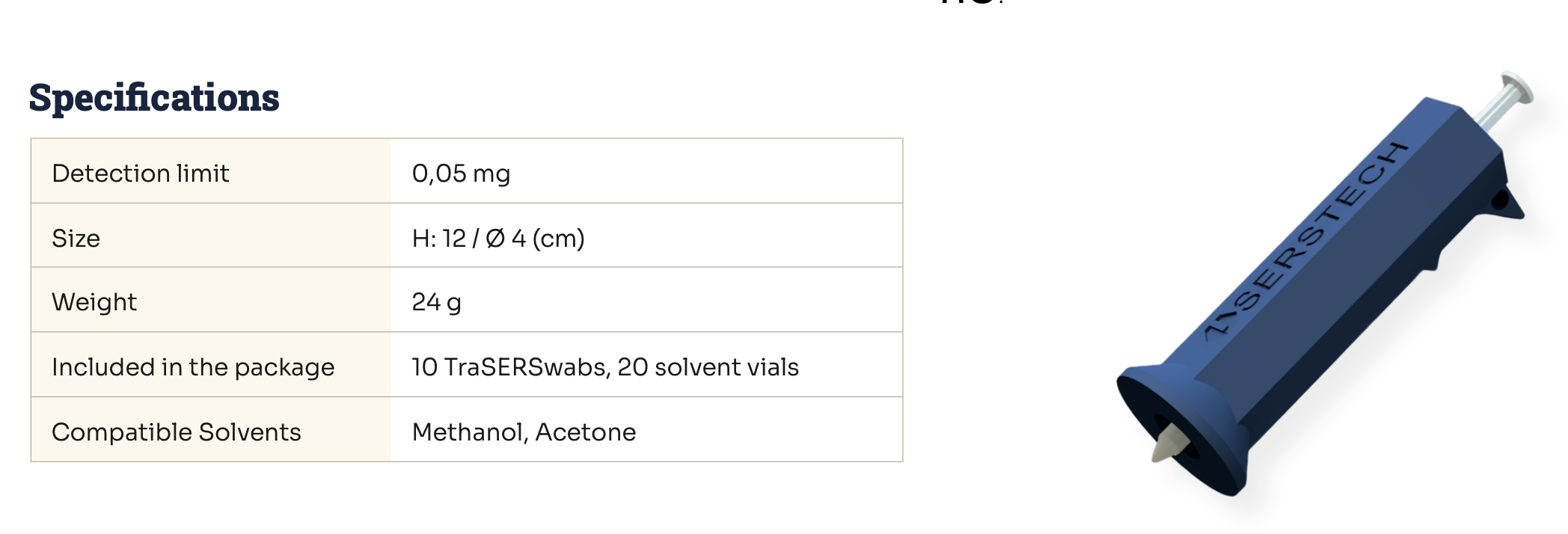 The TraSERSwab collects traces of powders from surfaces and accurately transfers them onto the SERS kit for analysis. Together with the SERS kit, it enables the detection and identification of a wide range of chemicals, including narcotics and chemical warfare agents, in amounts as low as 0.05 mg.